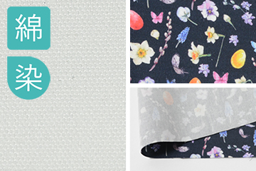 | 説明 | 綿100%、キャンバス地のようなざらつき、生地の目は少し粗く、細かい凹凸感がある中厚手の平織P下生地です。やや柔らかいですが、しっかりとした丈夫な生地なのでポーチやバッグを作る時にもご使用いただけます。他にもクッションカバー、アートキャンバス、ジャケットの用途に適しています。 顔料インクジェットプリントでも取り扱っています。染料インクジェットで印刷加工をすると、黒や紺色などの濃色がより濃く表現されて綺麗です。赤色も綺麗に印刷されます。染色堅牢度が高く、生地の風合いが柔らかいです。生産工程で蒸し、水洗を行うため糸が動き、生地目が斜めになる可能性が高く、長方形や直線の表現はやや苦手です。直線を綺麗にプリントしたい場合は顔料インクジェットをお薦めします。また、水洗をする際に、糸が多少毛羽立ちます。 |